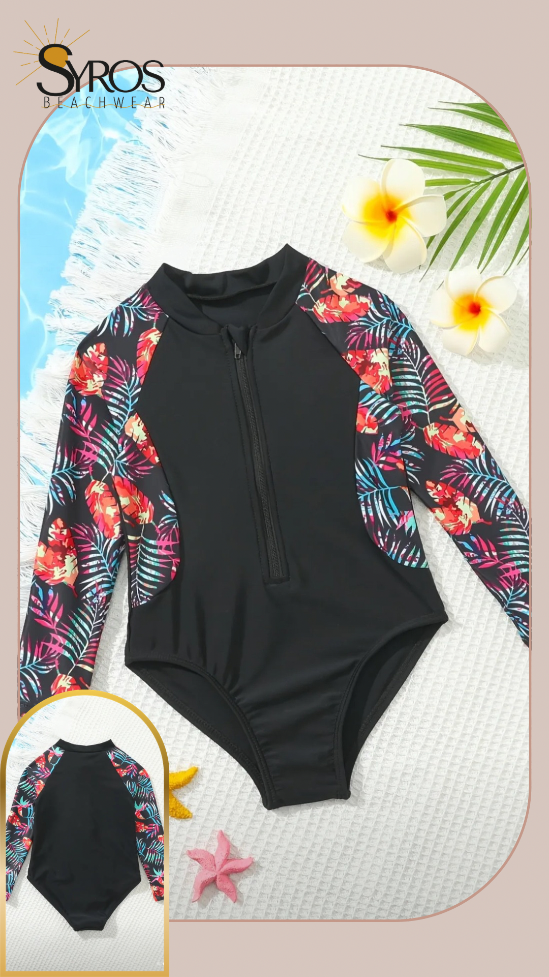 Entero manga larga negro con mangas y costados estampados palmas de colores